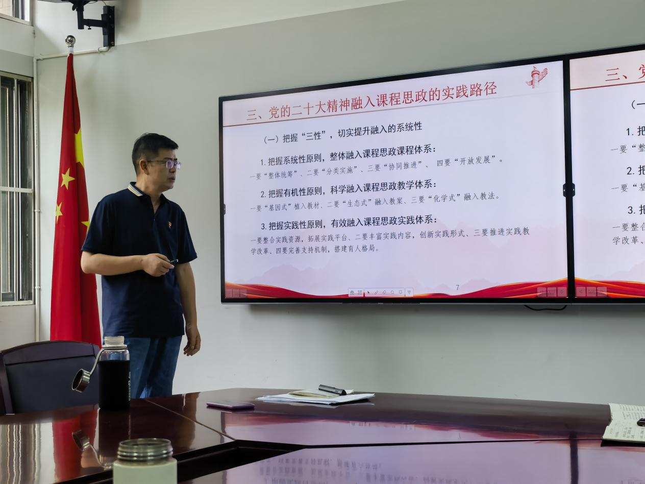 马克思主义公司李三强书记围绕课程思政建设展开专题辅导。李三强书记带领在场师生认真导读了《中国共产党第二十次全国代表大会报告》读本,深入解读了党的二十大精神,并对党的二十大融入课程思政建设的主要内容、价值意蕴和实践路径进行了细致地讲解。