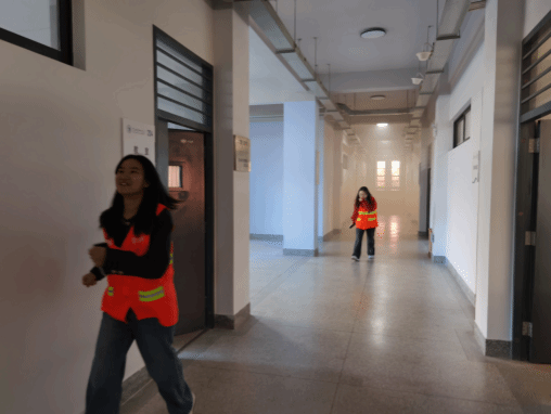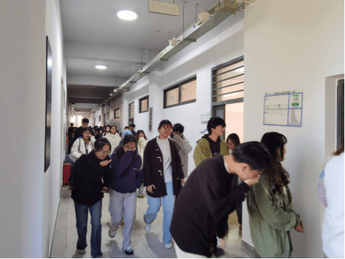 本次演练模拟教学楼发生火灾,随着教学楼区域突然升起的模拟浓烟和紧急广播警报响起,正在上课的师生们迅速用湿毛巾或衣袖捂住口鼻,保持低姿势弯腰前行,沿着指定的安全疏散路线,快速而有序地向楼外空旷地带撤离,整个过程紧张而有序。