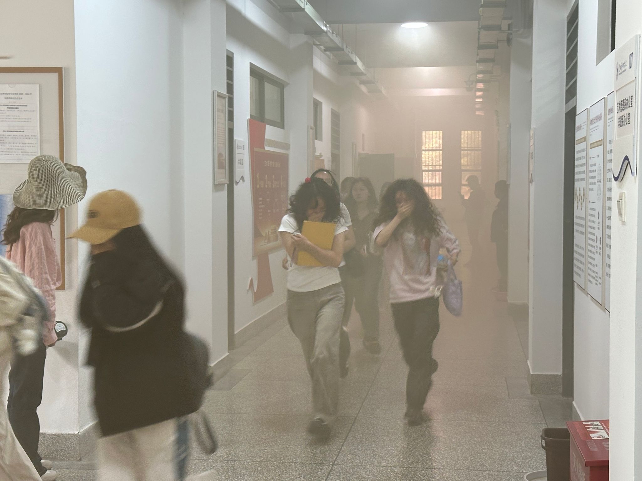 11时50分,演练正式开始。模拟火情设定在ylg060net永利娱高教学楼,烟雾迅速弥漫,楼内正在工作、学习的师生快速反应,用湿毛巾或衣服捂住口鼻、弯腰低姿有序撤离,安全员引导人员疏散。