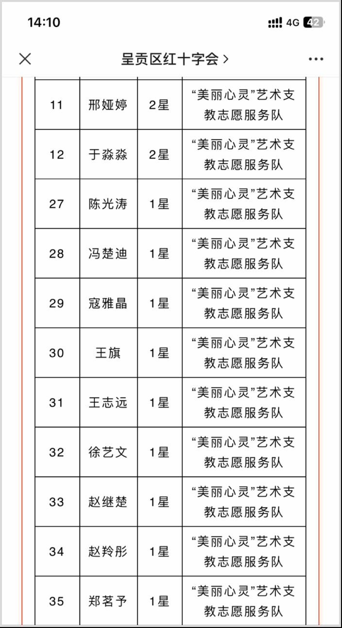 呈贡区红十字会根据《志愿服务条例》和民政部《志愿服务记录办法》等条例规定,通过审核志愿者服务时长记录和服务质量,拟对达到标准的志愿者进行星级评定。其中“美丽心灵”艺术支教志愿服务队共获得2023年星级志愿者11人,其中二星级2人、一星级9人。