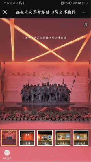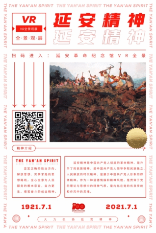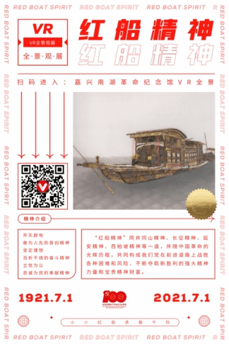 该部分不仅以传统的美术作品为展示形式而且结合了VR新科技,通过升级扫码的方式实现足不出展厅就如身临其境一般全景观展。如:该部分展出的红船精神,通过手机扫描二维码即可全景参观嘉兴南湖纪念馆。