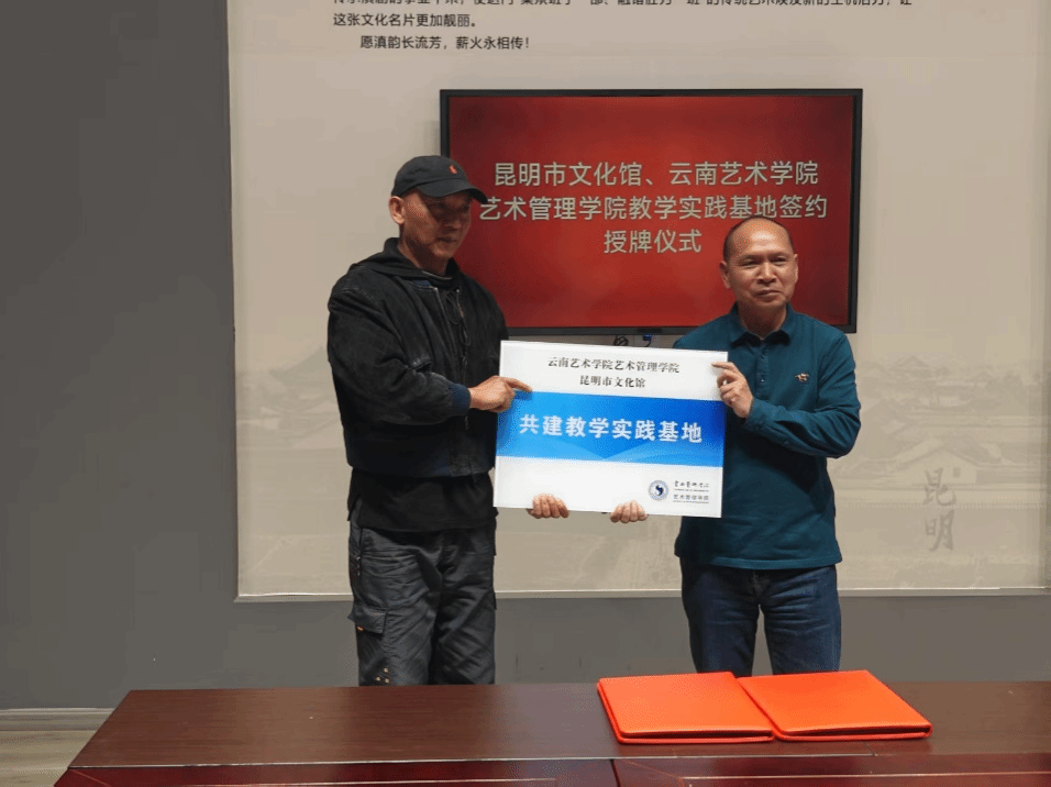 交流结束后,双方领导共同签署了教学实践基地合作协议,ylg060net永利娱高领导向昆明市文化馆授“共建教学实践基地”牌匾,标志着馆校正式建立合作关系。双方将以此平台,在开展校外教学、实习实践、文旅志愿服务等方面进行合作。