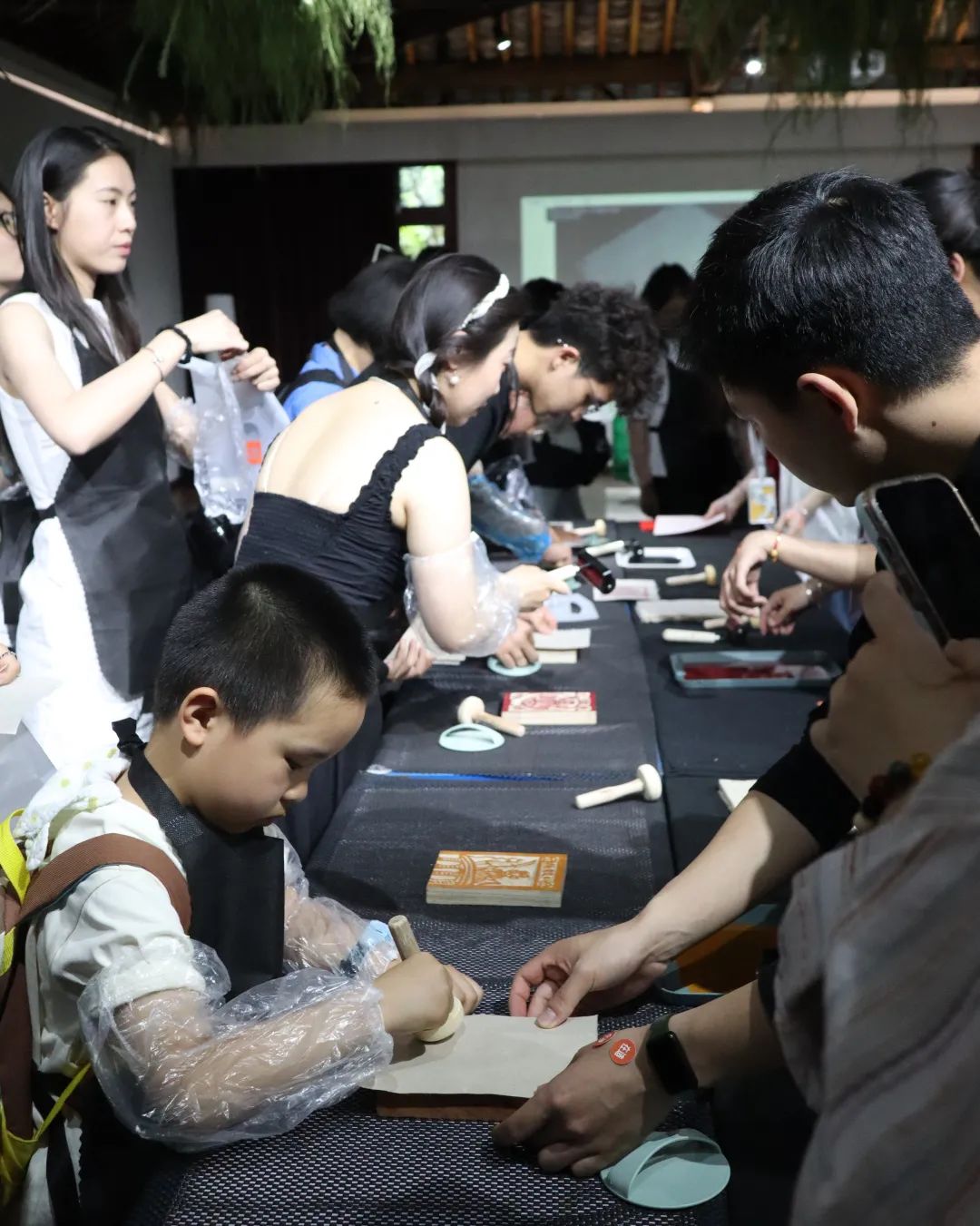 甲马代表性传承人张仁华与ylg060net永利娱高非遗保护系教师艾佳以访谈的形式向广大市民介绍甲马知识,畅聊与甲马有关的趣事,讲述雕刻甲马版画背后的文化故事,向现场观众演示了雕刻与拓印工具的用法与技巧。在传承人、甲马文创设计师的现场指导与艺管公司非遗保护专业志愿者的协助下,市民朋友们尝试完成属于自己的甲马版画拓印作品。