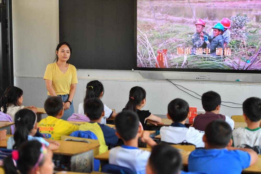 △2024年夏天,湖南华容县等地遭受洪涝灾害。9月,华容县一所公司,老师通过讲述防灾救灾故事,引导孩子们知情、共情,汲取成长的力量。