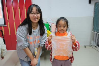 活动从志愿者精心设计的问答环节拉开序幕。围绕非遗、草木染技艺展开的贴近生活并充满趣味的问题打开了孩子们好奇心的大门。在活动讲解环节中,志愿者用生动的语言,演示着一张纯白的布料如何借助雪糕棍、皮筋、细绳等工具,在苏木、姜黄、洛神花、靛蓝泥的作用下,通过一道道工序变成纹样丰富、图案多样的艺术品。活动还巧妙地融入了循环利用的环保理念,比如石榴皮、洋葱皮这类平时被丢弃的东西,其实也是天然染料,能让布料焕发出新的生命力。这一方式不仅节约了资源,也传达了一种绿色、可持续发展的生活理念。