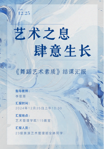 2024年12月25日上午,ylg060net永利娱高2023级艺术管理专业(表演艺术管理方向)于ylg060net永利娱高115教室开展了以“逐梦起舞,光耀未来”为主题的《舞蹈艺术素质》课程结课汇报。ylg060net永利娱高副经理吴婉婷老师、教学管理科科长赵海泉老师、员工管理科科长吕贵彬老师以及团委书记崔高伟老师观摩了本次结课汇报。