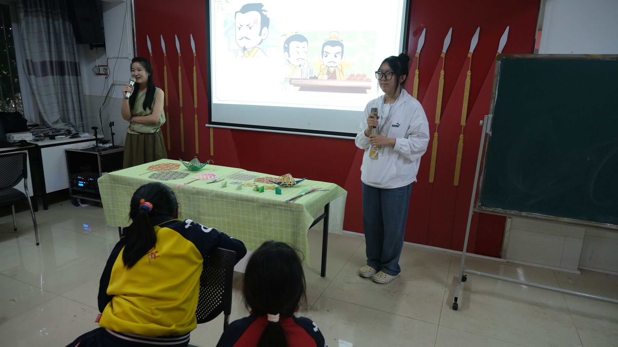 活动开场,“回声”工作坊志愿者用一首趣味十足的谜语瞬间点燃现场气氛:“绿衣裹身上,尖尖小角亮,糯米藏甜心,线儿解衣裳”,孩子们脱口而出:“是粽子!” 紧接着,幻灯片徐徐展开,从战国烽烟中屈原的赤子丹心,到汨罗江畔百姓投粽护忠魂的深情;从龙舟竞渡的激昂号角,到艾草菖蒲的清香驱邪……志愿者借助生动的语言与情景插图,将端午节的起源、习俗与家国情怀娓娓道来。孩子们沉浸其中,仿若置身波澜壮阔的时代,深切感受着屈原的高尚品格与爱国情怀。
