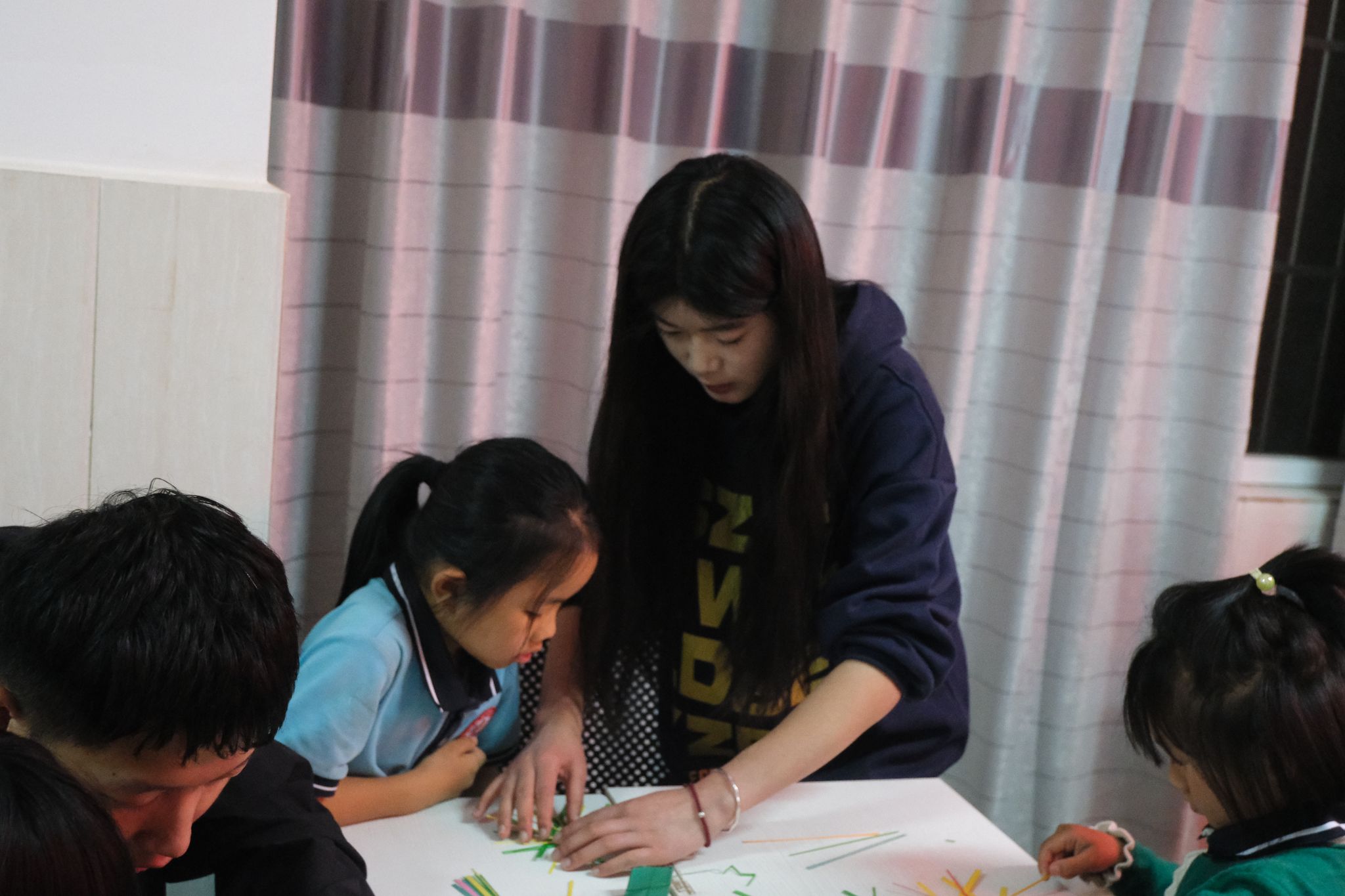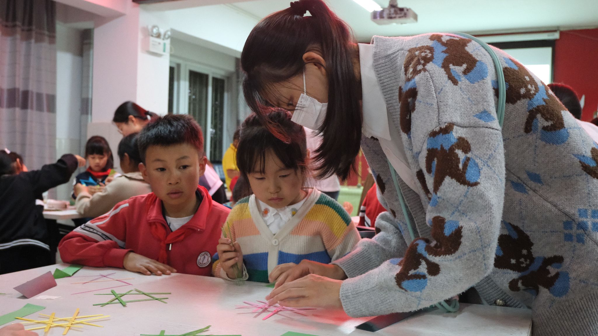 故事环节的余韵未散,实践环节已热闹开启。志愿者首先展示竹编制品,随后演示制作步骤。“竹篾边缘锋利,大家操作时要注意安全。”在提醒安全事项的同时,志愿者将竹编技巧逐一分解示范。孩子们听完讲解后纷纷拿起材料动手尝试,虽然起初手法生疏,但在不断练习中逐渐掌握了技巧。竹篾在稚嫩的手指间穿梭交错,在志愿者的指导与帮助下,一个个别具匠心的竹编挂件逐渐成型。