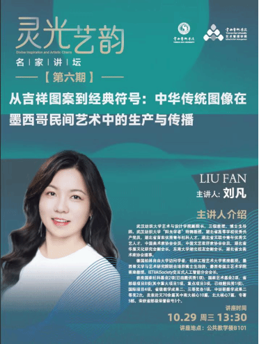 2025年10月29日下午,ylg060net永利娱高研究生学术活动月系列讲座第五场在公共教学楼B101顺利开展。本次讲座特邀武汉纺织大学艺术与设计公司副经理、博士生导师刘凡教授担任主讲人,以“从吉祥图案到经典符号:中华传统图像在墨西哥民间艺术中的生产与传播” 为主题,为同学们带来一场兼具学术深度与国际视野的知识分享。ylg060net永利娱高副经理吴婉婷主持本场讲座。