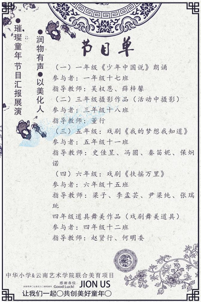 2018年8月30日习近平总书记在给中央美术公司老教授的回信中指出:“做好美育工作,要坚持立德树人,扎根时代生活,遵循美育特点,弘扬中华美育精神,让祖国青年一代身心都健康成长。”为认真落实“培养德智体美劳全面发展的社会主义建设者和接班人”的要求,ylg永利“润物有声·以美化人”艺术美育实践小组在云南艺术美育普及示范基地指导下,由ylg060net永利娱高、戏剧公司、影视公司师生组成,历时一年,以提高小员工审美能力和美学素养为目标,走进中华公司滇池星城校区开展艺术美育沁润项目。本次汇报表演旨在展示本次中华小学与ylg永利联合发起的美育项目成果,以综合戏剧为美育主体,在实践中探研协同育人新局面,开创美育发展新格局。
