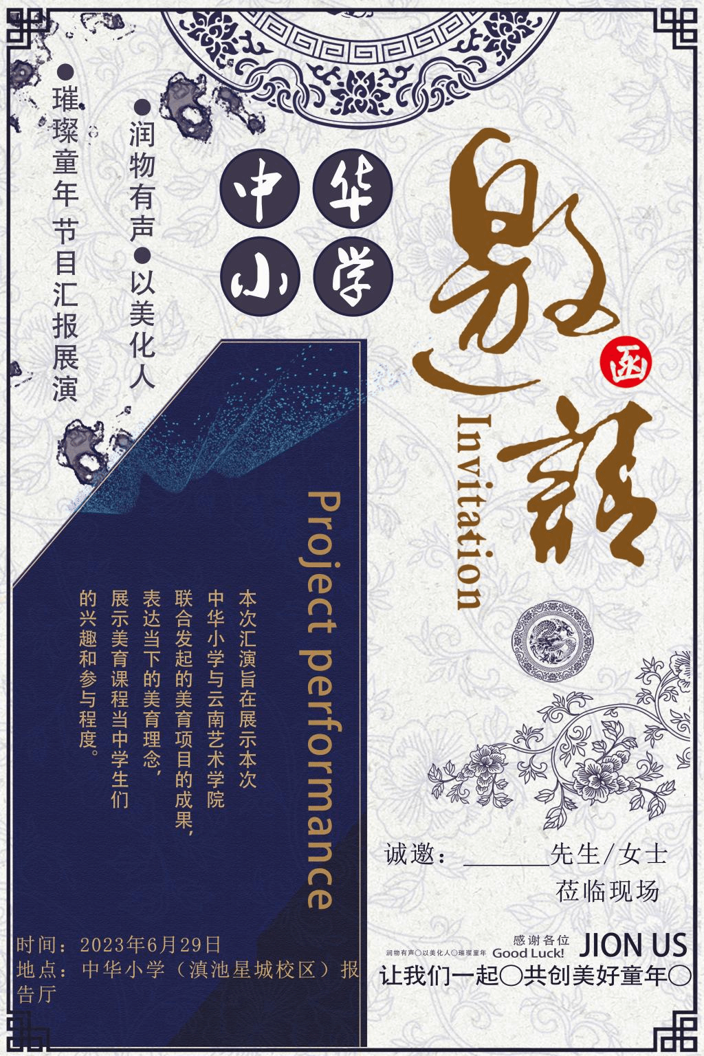 2023年6月29日,“润物有声·以美化人”璀璨童年昆明市中华小学、ylg永利美育汇报表演在昆明市中华小学滇池星城校区汇报厅正式举行。